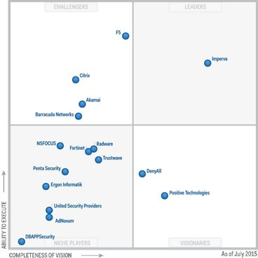 Компания Positive Technologies специализируется в области противодействия кибератакам и включена аналитической компанией Gartner в «магический квадрант» (см. рисунок), объединяющий мировых производителей решений для защиты веб-приложений (2015 Magic Quadrant for Web Application Firewalls). Российский продукт PT Application Firewall попал в квадрант Visionaries. Согласно методике Gartner, такие продукты имеют инновационные функции и решения, определяющие развитие рынка.
