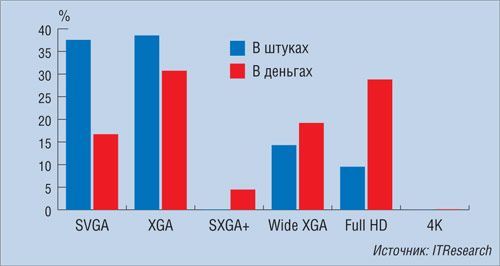 Устройства Wide XGA (1280×800) формируют массовый рынок, а модели Full HD (1920×1080) — его «продвинутую» составляющую. Первых проекторов при этом продается в полтора раза больше, однако в денежном выражении соотношение между ними обратное.