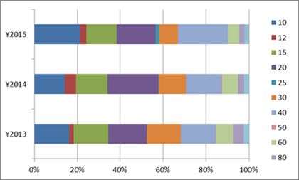 По данным аналитической компании ITResearch, на классические модели мощностью от 10 до 100 кВА стабильно приходится около 60% всего ассортимента трехфазных ИБП. При этом не все мощностные модификации одинаково популярны. Наиболее продаваемые из них — мощностью 10, 15, 20, 30, 40 и 60 кВА (см. рисунок), и в последние годы структура продаж по мощностям в целом довольно стабильна.