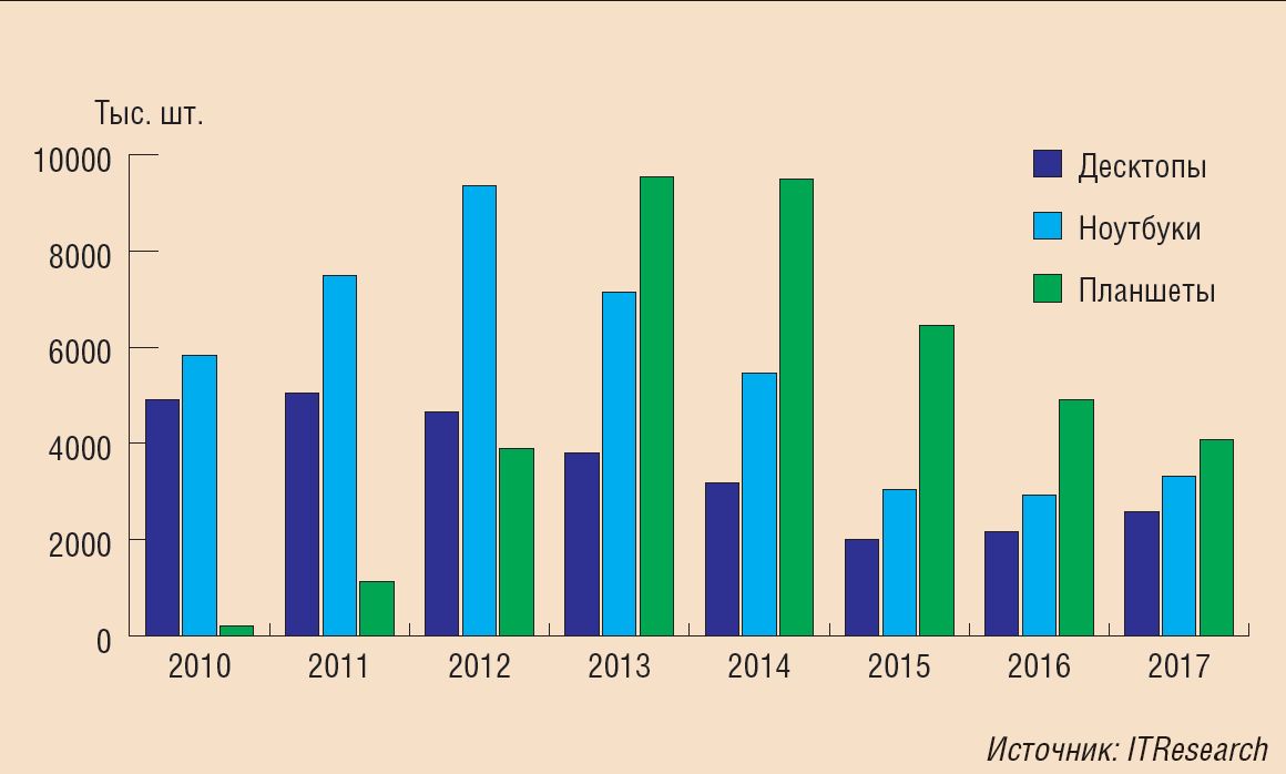 Продажи в натуральном выражении различных категорий компьютеров: настольных ПК, ноутбуков и планшетов – 2010-2017 гг.