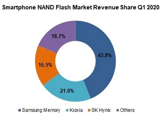 Тройка лидеров среди поставщиков NAND-памяти для смартфонов в денежном выражении осталась в I кв. 2020 г. неизменной: это Samsung Memory (44%), Kioxia (21%) и SK Hynix (16%).
