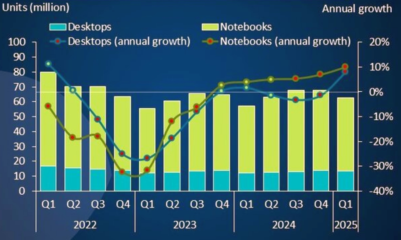 По оценке исследователей из Canalys, ныне подразделения компании Omdia, в I кв. текущего года в мировой канал продаж было отгружено 62,7 млн ПК, настольных и мобильных, — на 9,4% больше, чем за аналогичный период 2024 г. И это можно было бы воспринимать как предвестье дальнейшего восстановления глобального сегмента ПК, а возможно, и всего ИТ-рынка в целом, но разразившаяся в начале апреля торговая (с массированным применением импортных пошлин) война между США и практически всем остальным миром заставляет усомниться в обоснованности вообще каких бы то ни было рациональных прогнозов на обозримую перспективу.
