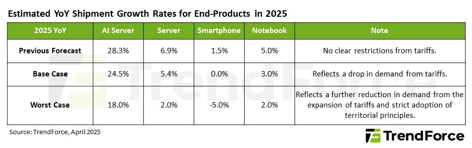 Объявление американской администрацией 2-го апреля новых «взаимных» импортных пошлин на товары едва ли не всех стран и территорий планеты, и прежде всего поступающие из материкового Китая, равно как и последовавшее всего через неделю с небольшим извлечение из-под тарифного обложения целого ряда высокотехнологичных устройств (смартфонов, ноутбуков и проч.) изрядно фраппировало как участников глобального ИТ-рынка на всех континентах Земного шара, так и аналитиков. Специалисты TrendForce заявили, что вынуждены пересмотреть прежние прогнозы по мировым поставкам компьютеров, серверов и иного высокотехнологичного оборудования до конца текущего года (см. таблицу), а также что точность любых новых оценок неизбежно удручающе низка как раз по причине непредсказуемости дальнейших шагов США и их визави в развернувшемся тарифном противостоянии.