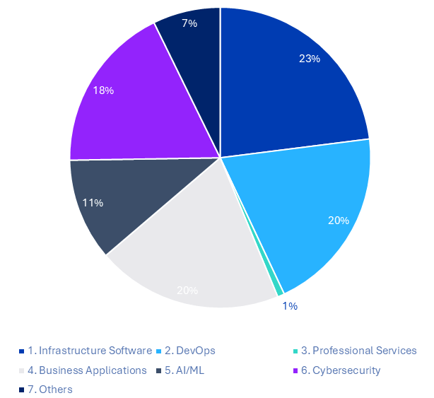 Доли различных технологических направлений, %, в расходах заказчиков на закупки (включая подписку) корпоративного ПО на гиперскейлерских маркетплейсах в 2025 г.