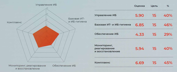 На рис. 3 приведена паутинообразная диаграмма, которая отображает усредненные цифры, характеризующие ситуацию с пятью направлениями ИБ-зрелости у компаний, ИБ-специалисты которых приняли участие в исследовании.