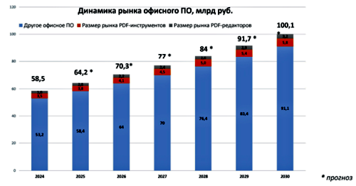 Из оценок Сontent AI, основанных на открытых данных, следует, что по ожидаемым итогам 2026 г. российский рынок офисного ПО составит ₽70,3 млрд. Из них ₽4,1 млрд придётся на ПО для просмотра PDF-файлов, а 2,2 млрд руб.) — на ПО для редактирования PDF-файлов. Прогноз динамики этого рынка (до 2030 г. включительно) приведен на рис. 3.