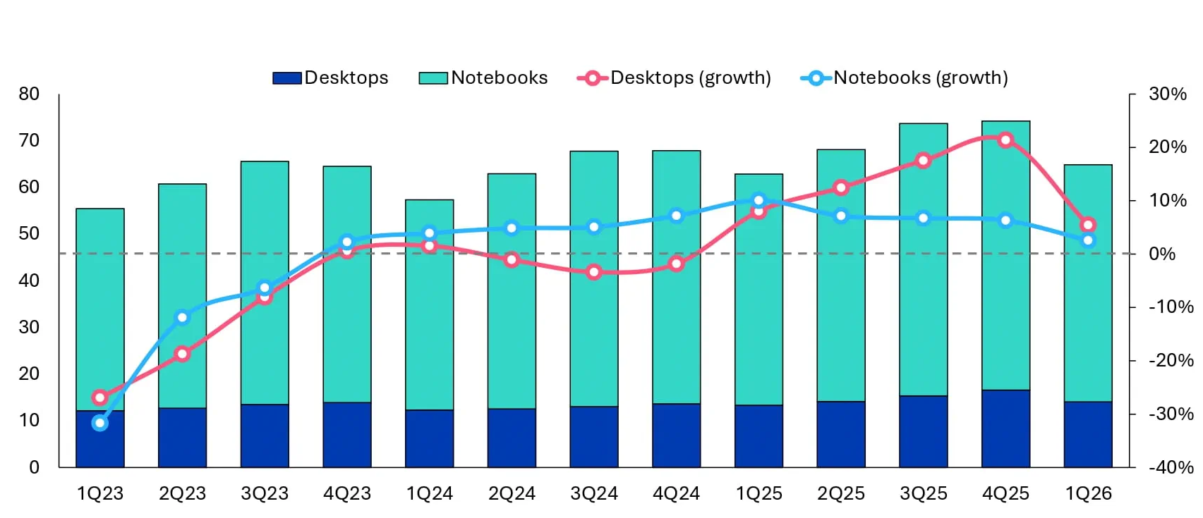 Отгрузки персональных компьютеров всех видов — настольных и мобильных, с базовой производительностью и рабочих станций — за первые три месяца текущего года по всему миру в Omdia оценили в 64,8 млн единиц, что на 3,2% больше, чем за аналогичный период 2025-го. Хотя настольные системы по отдельности показали ещё более впечатляющий рост, +5,4% год к году, их было поставлено всего 14,0 млн единиц. Подсегмент же ноутбуков пострадал сильнее: отгружено 50,8 млн единиц; +2,6% в годовом выражении.
