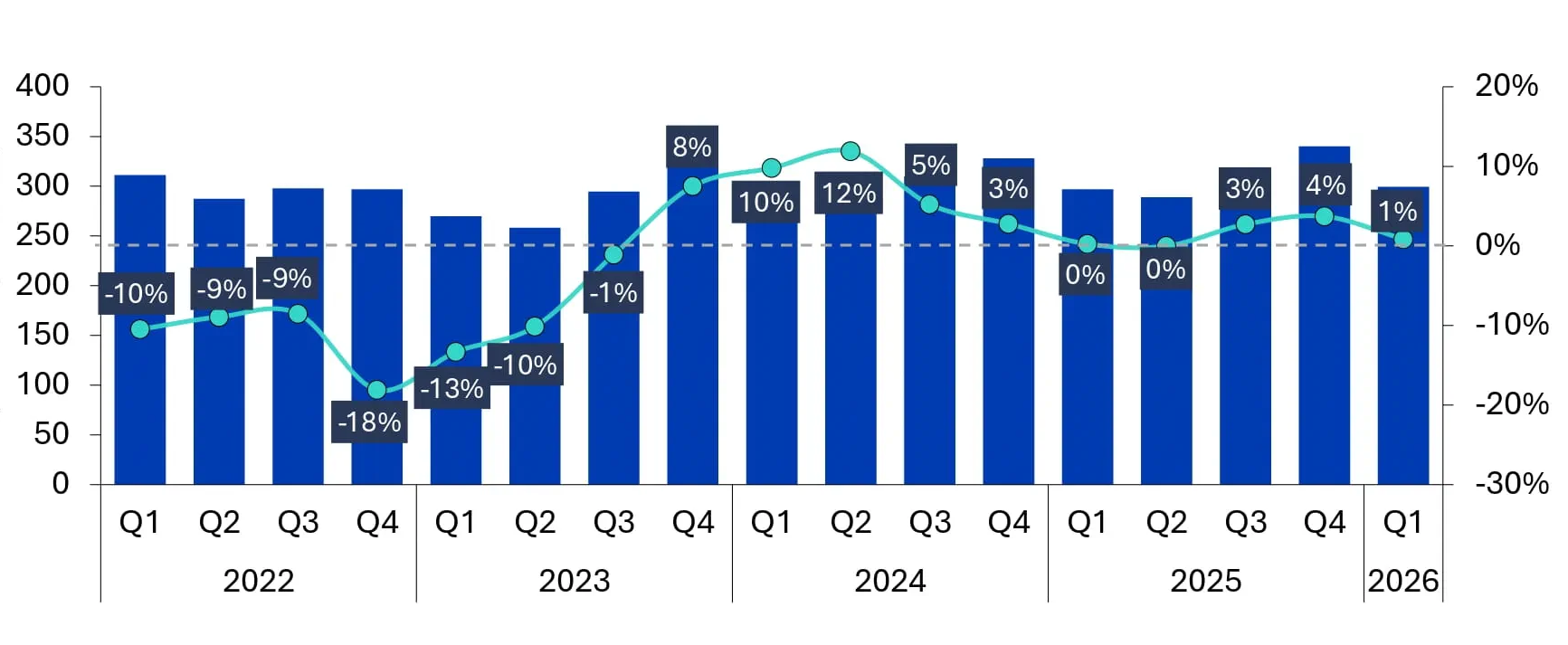 По предварительной оценке Omdia, за I кв. 2026 г. в мировой канал продаж было отгружено немногим менее 300 млн смартфонов — на 1% больше, чем за аналогичный период годом ранее. Эта величина, пусть и незначительная, оказалась выше ожиданий аналитиков, которые ранее прочили смартфонному сегменту глобального ИТ-рынка переход к отрицательной динамике из-за резкого повышения цен на основные компоненты для мобильных гаджетов; прежде всего — на микросхемы памяти.
