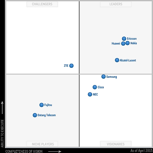 К лидерам рынка Gartner относит Ericsson, Huawei, Nokia и Alcatel-Lucent. У первых трех вендоров практически одинаково сильные позиции, а компания Alcatel-Lucent, которая в скором времени должна войти в состав Nokia, уступает им по успешности реализации проектов LTE.