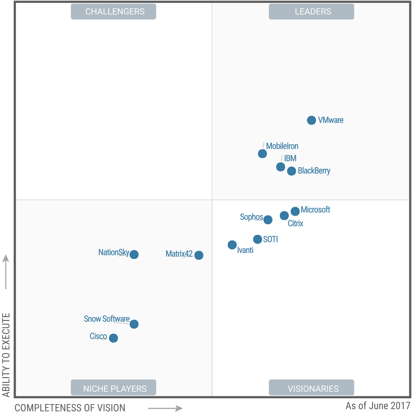 Среди пяти вендоров-визионеров Gartner назвало хорошо известных в России Citrix и Microsoft. В этом году Citrix стала продвигать свой продукт XenMobile как дополнительный пакет к EMM-решению Microsoft Intune. Он тесно интегрирован с другими технологиями Citrix, в том числе пакетами виртуализации десктопов и приложений, но не поддерживает iOS 10.x и Android и уступает другим EMM по возможностям управления клиентскими устройствами.