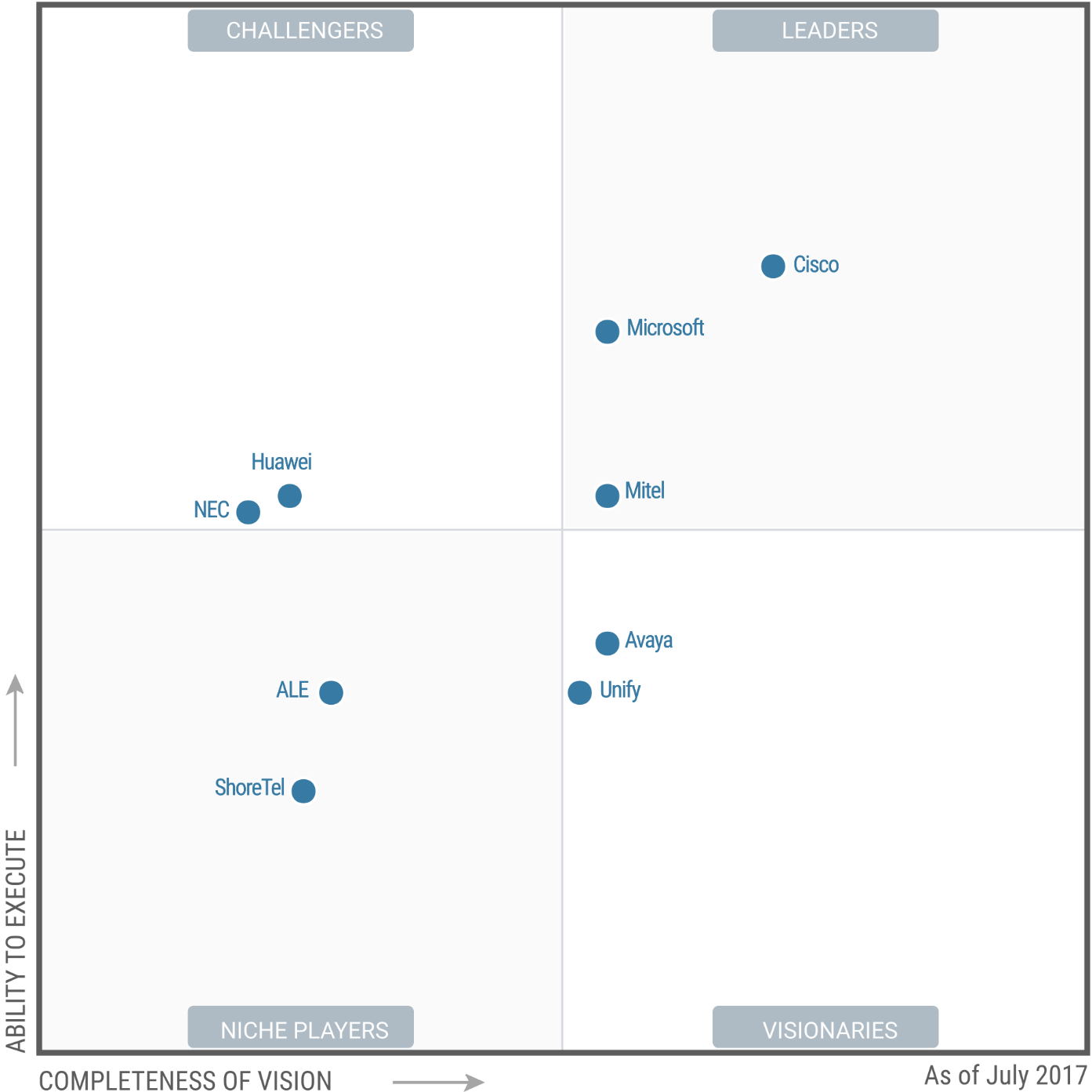 К лидерам рынка Gartner относит компании Cisco, Microsoft и Mitel. (см. рисунок).