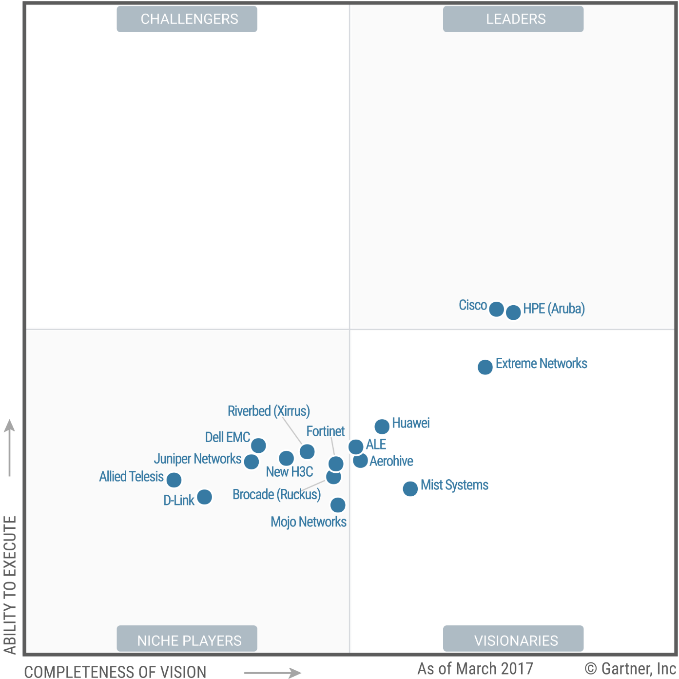 Компания Gartner опубликовала магический квадрант по сетевому оборудованию уровня доступа Magic Quadrant for the Wired and Wireless LAN Access Infrastructure. По сравнению с прошлогодней версией отчета в редакции 2017 г. группа лидеров не изменилась и состоит только из двух вендоров – Cisco и Aruba, входящего в состав HPE (см. рисунок).