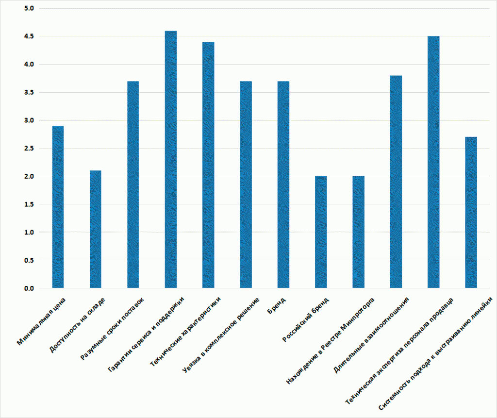 Ещё меньшее значение эксперты отдают параметру "Доступность на складе". В отличие от "Разумных сроков доставки", которые относятся к ключевым факторам. И здесь, понимая специфику класса оборудования, всё логично и для поставщика и заказчика.