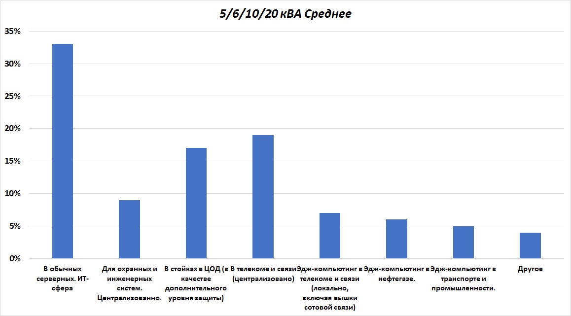 Как было сказано выше, в рамках Опроса в первую очередь выяснялись основные сферы применения RT ИБП, что необходимо для понимания емкости различных целевых рынков и, соответственно, правильной разработки и позиционирования моделей. Здесь мы приводим средние значения, но хотим отметить, что взвешенные (с учетом емкости бизнеса игроков) оценки были очень близки, что говорит о том, что данные устойчивые и точные.