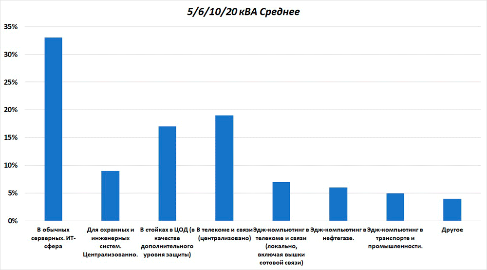Как и в случае легкого сегмента, ключевым направлением, где используются средние и тяжелые (5/6/10/20 кВА) RT ИБП, экспертами была указана ИТ-сфера, включая обычные серверные. На нее, по мнению участников рынка, приходится 33% от всех продаж данного оборудования. Еще 19% приходится на телеком и связь.