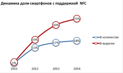 Рынок бурно развивается, в том числе и в России. По данным департамента маркетинга компании «Евросеть», доля продаж смартфонов с поддержкой функции NFC по итогам 2014 г. достигла в России уже 18%. Правда, динамика роста уменьшается, достаточно сказать, что по сравнению с 2013 г. доля этих устройств на российском рынке смартфонов увеличилась лишь на 1,5%.