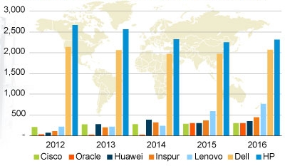 Компания Huawei в 2015 г. снизила поставки по сравнению с 2014 г., однако в 2016 г. она, вероятно, наверстает упущенное (см. диаграмму). В пятерку лидеров рынка входит также компания Inspur, занимая на нем четвертую позицию.