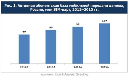 По состоянию на конец 2015 г. в России насчитывалось 107 млн активных абонентов мобильной передачи данных (SIM-карт). Абонентская база выросла на 9% по сравнению с результатами 2014 г. (см. рис. 1). Основными драйверами роста числа пользователей мобильной передачи данных являются растущее проникновение смартфонов и планшетных ПК, а также развитие рынка M2M.