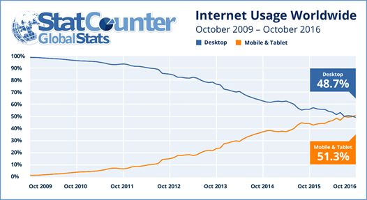 В октябре 2016 г. количество подключений к сайтам с мобильных устройств по всему миру впервые превысило использование Интернета со стационарных компьютеров и ноутбуков. Об этом свидетельствуют данные исследования ирландской независимой аналитической компании StatCounter*.