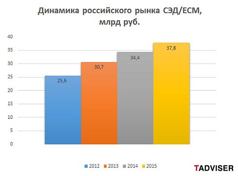 По данным компании TAdviser, по итогам 2015 г. российский рынок СЭД/ECM-систем в рублевом выражении вырос на 10% и достиг отметки в 37,8 млрд руб. В сравнении с 2014 г. рост рынка замедлился, но несущественно (см. диаграмму). В первую очередь на рынок повлияли общеэкономические факторы. Кроме того, сократилось количество новых внедрений.