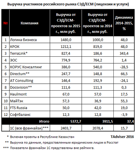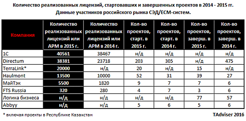 По количеству реализованных лицензий или автоматизированных рабочих мест по итогам 2015 г с большим отрывом лидируют компании 1С и Directum (см. табл. 2).