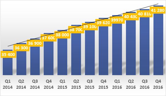 По предварительным данным ИАА TelecomDaily, общее количество абонентов платного ТВ в России по итогам 2016 г. составило 41,28 млн абонентов. Таким образом, зафиксирован прирост за год на уровне 1,66 млн новых подписчиков. Четвертый квартал 2016 г. оказался самым лучшим по приросту абонентов в прошедшем году (см. диаграмму 1).