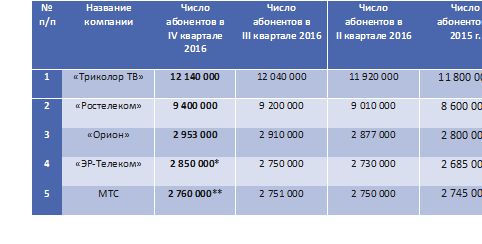 Лидер рынка, спутниковый оператор «Триколор ТВ», за 2016 г. увеличил абонентскую базу на 340 тыс., до 12,14 млн домохозяйств (см. таблицу). Второй по величине игрок, «Ростелеком», увеличил базу подписчиков на 800 тыс., до 9,4 млн. Идущий третьим «Орион» увеличил базу на 153 тыс., до 2,953 млн абонентов, укрепив свои позиции в тройке лидеров и не позволив компании «ЭР-Телеком» обойти себя, несмотря на покупку «ВестКолл».