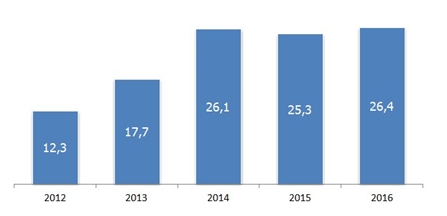 Рис. 1. Динамика российского рынка смартфонов в 2012-2016 гг., в млн штук.