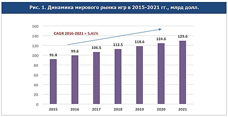 Согласно прогнозам J’son and Partners Consulting, объем мирового рынка игр к 2021 г. составит почти 130 млрд долл., демонстрируя средние ежегодные темпы роста в период 2016-2021 гг. на уровне 5,4% (см. рис. 1).