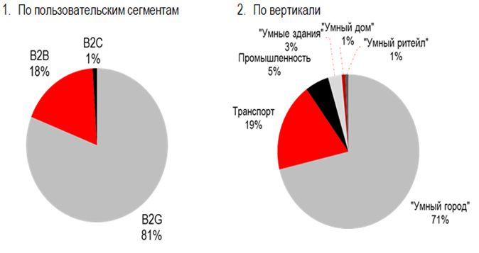 При этом резко выделяется роль государственного сектора (В2G), представленного решениями «умного города» и частично внедрениями телематических решений на транспорте. Согласно оценкам iKS-Consulting, сегмент B2G генерирует более 80% всех доходов российского рынка IoT (рис. 1). Помимо прямого спроса на решения со стороны государственного сектора, государство также играет заметную роль в стимулировании развития IoT в качестве регулятора. К примеру, в розничной торговле распространению различных IoT-решений способствуют такие нормативно-правовые изменения, как поэтапное внедрение системы маркировки товаров, изменения в правилах отображения цены, реформа использования контрольно-кассовых аппаратов и т. д.