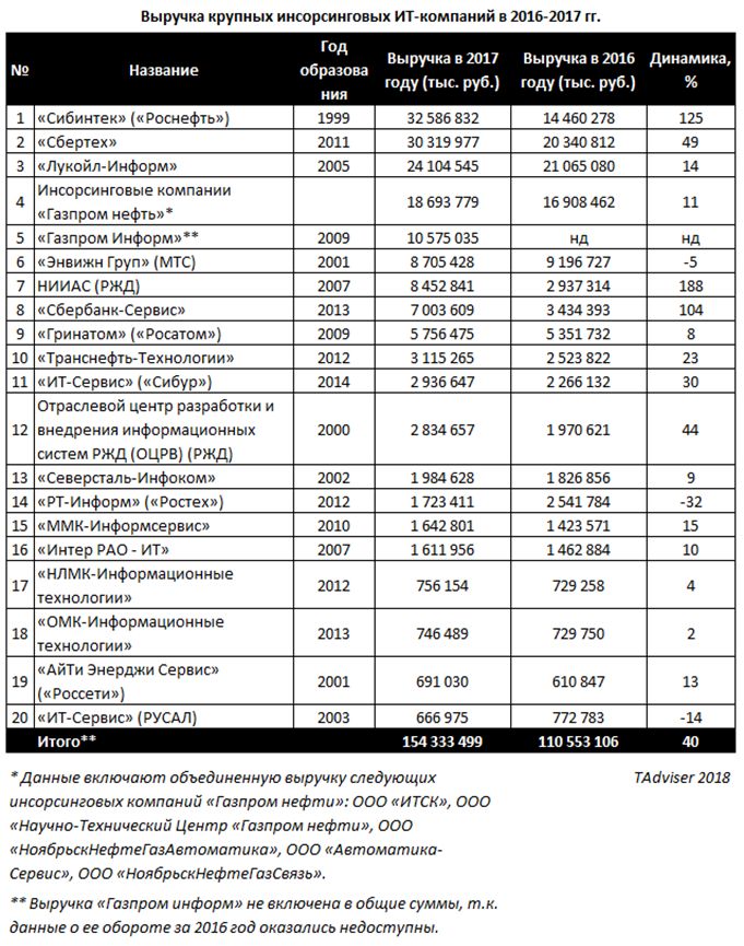 Как и в 2016 г., есть и исключения – у трех инсорсеров оборот показал сокращение: выручка снизилась у «РТ-Информ» (-32%), «ИТ-Сервиса» РУСАЛа (-14%) и «Энвижн Груп» (МТС) (-5%).