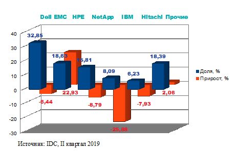 Львиную долю в поставках, около трети, по-прежнему занимает продукция Dell EMC, однако объёмы её отгрузок в долларовом исчислении сократились по сравнению со II кв. 2018-го на 6,44%. Вышедшая на второе место HPE (в прошлом году в том даже квартале она была третьей) напротив заметно нарастила свою долю на внушительные 22,93%. Остальные компании из первой пятёрки ЕМЕА (NetApp, IBM, Hitachi) в различной мере сократили свои доли. Особенно сильным падение было у IBM.