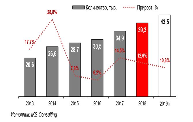 Динамика роста числа стойко-мест в РФ (2013-2019 гг.), тыс. ед.