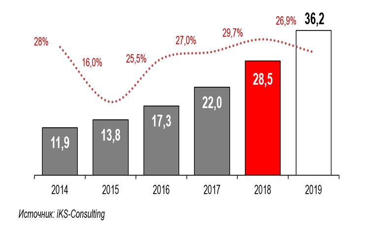 В условиях привлечения клиентов на появившиеся мощности совокупный уровень доходов российских поставщиков услуг ЦОД в течение 2018 г. достиг 28,5 млрд руб., что на 29,7% выше показателя годичной давности (22,0 млрд руб.). В валютном эквиваленте данный показатель к концу 2018 г. вырос на 20,6% — с $376,8 млн до $455,8 млн и на 2019 г. такая динамика, по мнению iKS-Consulting, сохранится, т.к. основные усилия сейчас будут направлены на закрепление качественных показателей услуг ЦОД и совершенствование достигнутых отношений с корпоративными клиентами. Помимо этого аналитики ожидают дальнейшего качественного обновления инфраструктурного базиса, которое, в частности, предполагает уход с рынка неконкурентоспособных компаний. iKS-Consulting видит сегодня серьезные предпосылки для активизации темпов роста рынка ЦОД в ближайшие годы.