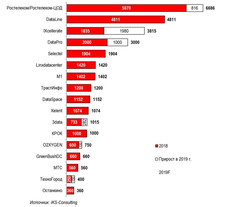 На четвертом месте компания DataPro, которая последовательно наращивает масштабы своего дата-центра в Москве, и к концу 2019 г. планирует ввести 3000 стойко-мест, заняв 6,9% рынка.