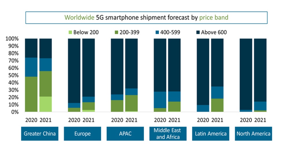 Структура мировых поставок 5G-смартфонов по регионам и ценовым стратам в 2020 и 2021 гг.