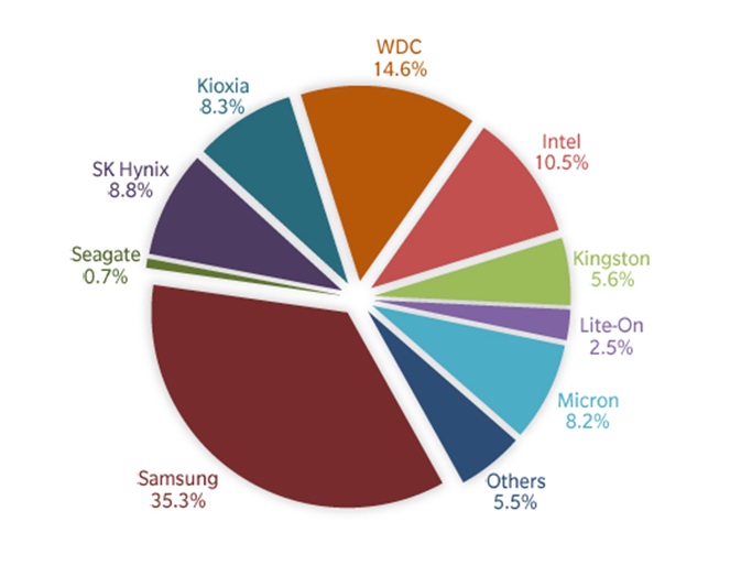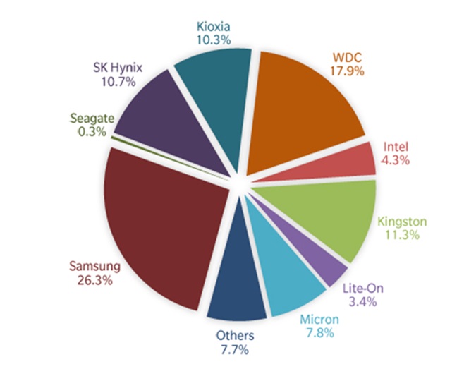 Среди вендоров достаточно уверенно лидирует Samsung, на долю которого приходится более четверти поставок в натуральном выражении ( см рис. 1). Далее с заметным отрывом следует WD, замыкают первую пятерку с достаточно плотными результатами Kingston, SK Hynix и Kioxia