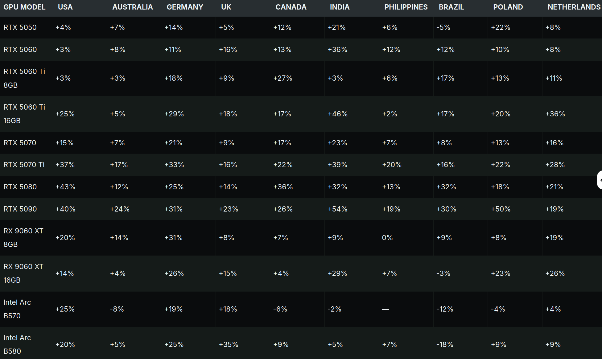 Бюджетная дискретная графика Nvidia с минимальным объёмом видеоОЗУ — модели RTX 5050, 5060 и 5060 Ti 8GB — по большей части дорожали умеренно, в среднем по миру на 9-14%, причём в Бразилии самая доступная видеокарта умудрилась даже подешеветь на 5% (зато в Польше она же взлетела в цене сразу на 22%).