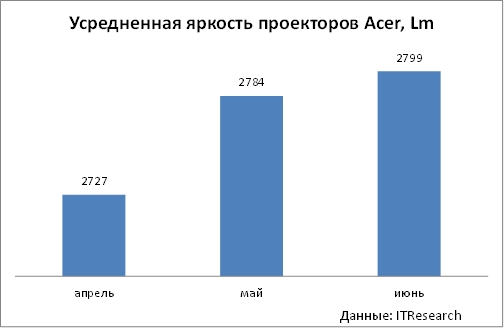 Из технологических трендов стоит отметить рост средней яркости проекторов Acer. Всего за пару месяцев она выросла с 2727 до 2799 Лм. Это очевидный тренд.