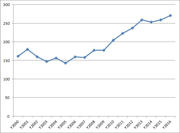 В 2013-2015 гг. данный показатель вышел на некоторое насыщение на уровне 250-260 долл. Если бы улучшилась конъюнктура массового рынка, теоретически можно даже ожидать определенный ценовой откат. Но мы все же рынок ждал возобновление тренда к продолжению роста средневзвешенной стоимости, пусть даже не с такими темпами, как в предыдущие годы. И данный прогноз полностью оправдался: средневзвешенная стоимость прибавила за год еще 10 долл., достигнув уровня в 270 долл. И, скорее всего, это еще не предел.