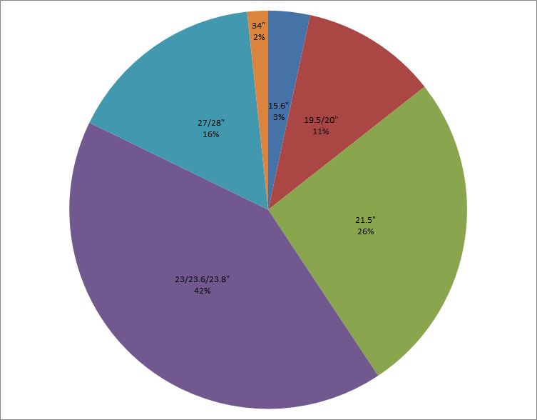 Наибольшей представленностью обладают крупные моноблоки с экраном 23-24″ (рис. 1.) — в общей сложности 49 моделей. Также обширно представлен типоразмер 22″ (21.5″).