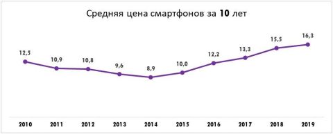В первой половине 10-летки цена смартфона стабильно снижалась. Это объясняется , с одной стороны, плавным переходом смартфона из эксклюзивного товара в мейнстримовый, а с другой — неблагоприятной ситуацией с покупательной способностью населения, пик которой пришелся на 2013 — 2015 гг. В дальнейшем наблюдался плавный рост средней стоимости смартфона на фоне бурного роста функциональных характеристик.