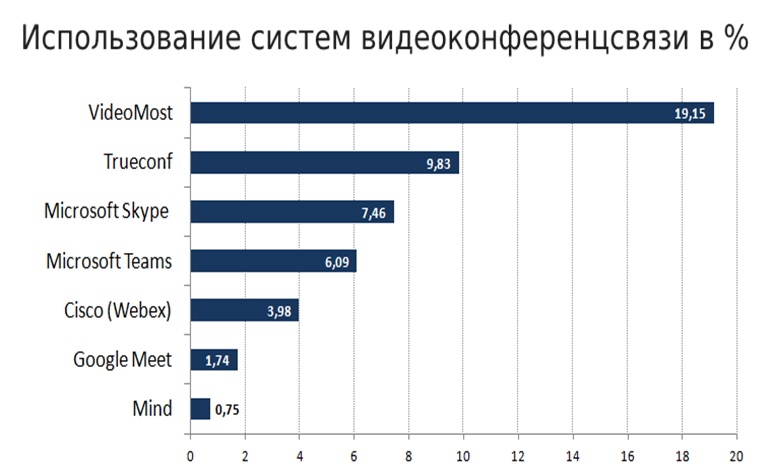 Как показало исследование ,пользователи из государственных и коммерческих организаций РФ используют видеоконференции VideoMost чаще, чем Skype и Teams. Согласно опросу, почти 20% всех респондентов использует VideoMost. Продукты Microsoft Skype использует 8% респондентов, Teams — 6%, Trueconf — 10%, Cisco Webex — 4%, Google Meet — 2%, Mind — 1%.
