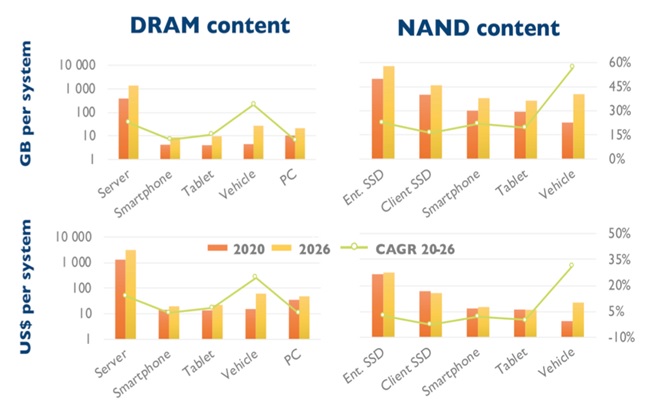 Так, в 2026 г., предсказывает Yole Développement, средний автомобиль будет содержать больше оперативной памяти, чем средний ПК, а типичный объём серверного ОЗУ перевалит за 1 Тбайт. В то же время стоимость подсистемы ОЗУ продолжит расти для всех областей применения, тогда как клиентские SSD образца 2026 г., превзойдя по объёму типичные для 2020-го модели, обойдутся покупателям дешевле.