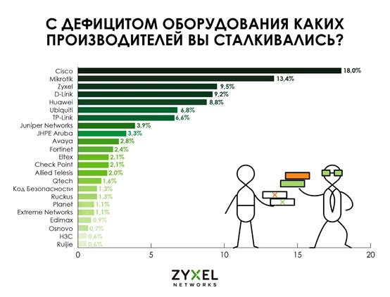 Лидером по дефициту среди торговых марок стало оборудовании компании Cisco — 18% участников опроса не смоги купить данного вендора. Чуть более 13% испытывали сложности с приобретением устройств от Mikrotik, а 9,5% — с Zyxel. Далее следуют D-Link — 9,2%, Huawei — 8,8%, Ubiquiti — 6,8%, TP-Link — 6,6%. Всего респондентам было предложено выбрать из 23-х производителей. (см подробнее рис.2)