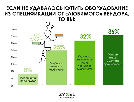 Ситуацию с задержкой поставки оборудования от нужного вендора 65% опрошенных охарактеризовали как терпимую. 18% сообщили, что готовы ждать сколько нужно, лишь бы получить то, что было необходимо первоначально. 17% оценивают задержку как чрезвычайно критичную для бизнеса.