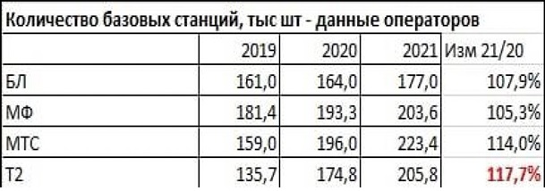 В этом отношении сеть Tele2, которая вводила максимальное количество станций в 2019-2021 гг., получила на данный момент преимущество на рынке. Высокое количество новых БС также отмечено у МТС.