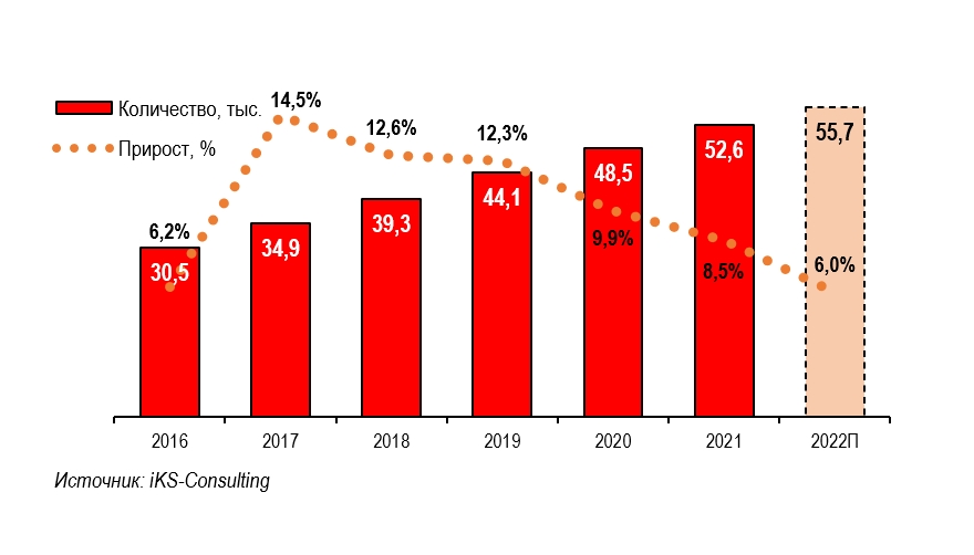 В настоящее время (сентябрь 2022 г.) iKS-Consulting придерживается консервативного прогноза развития рынка в краткосрочной перспективе, который составляет 55,7 тыс. стойко-мест на конец 2022 г. (рис. 1).