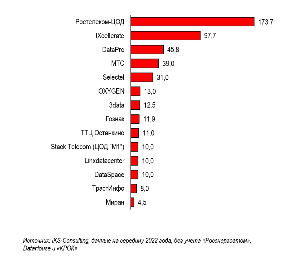 Компании Selectel и МТС, занимающие четвертое и пятое место в рейтинге, в 2022 г. не расширяли свои площадки, сохранив таким образом позиции неизменными.
