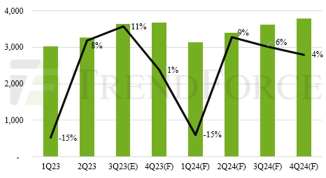 По оценке TrendForce, в мировом сегменте серверов положительная квартальная динамика II и III кв. текущего года (+8% и +11% в квартальном выражении, соответственно) уже на интервале последних трёх месяцев значительно, до 1%, затормозится, а в первом квартале 2024-го и вовсе продемонстрирует ровно такой же спад, как и за аналогичные три месяца 2023 г., — 15% от уровня предыдущего квартала. Вслед за этим аналитики ожидают нового взлёта (+9% во II кв. 2024-го, правда, от низкой базы первого квартала), а дальше до конца будущего года позитивная динамика хотя и сохранится, но будет постепенно снижать обороты.